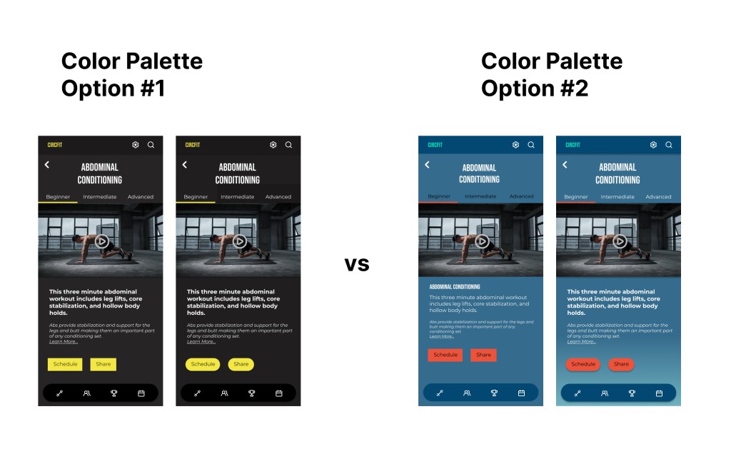 AB testing reveled that Option #1 was the more effective color palette for the app. It remained consistent with my vision for a professional fitness app like Nike and Peloton.