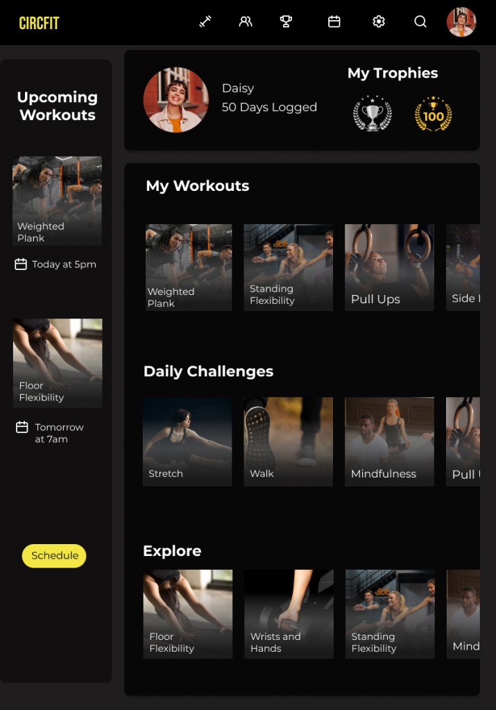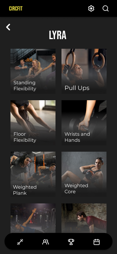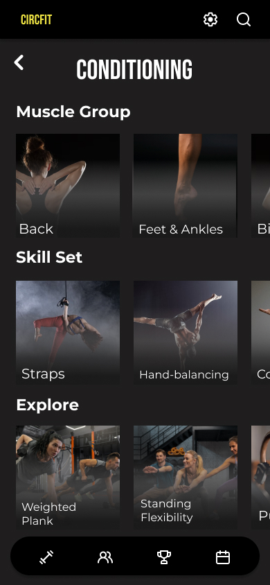 Designing a visual style in line with successful fitness companies such as Nike and Peloton provided a solution to the problem statement: a top fitness app for both the professional and casual circus artist.