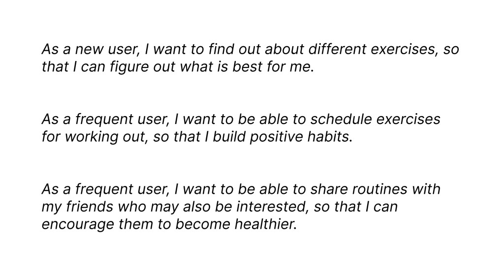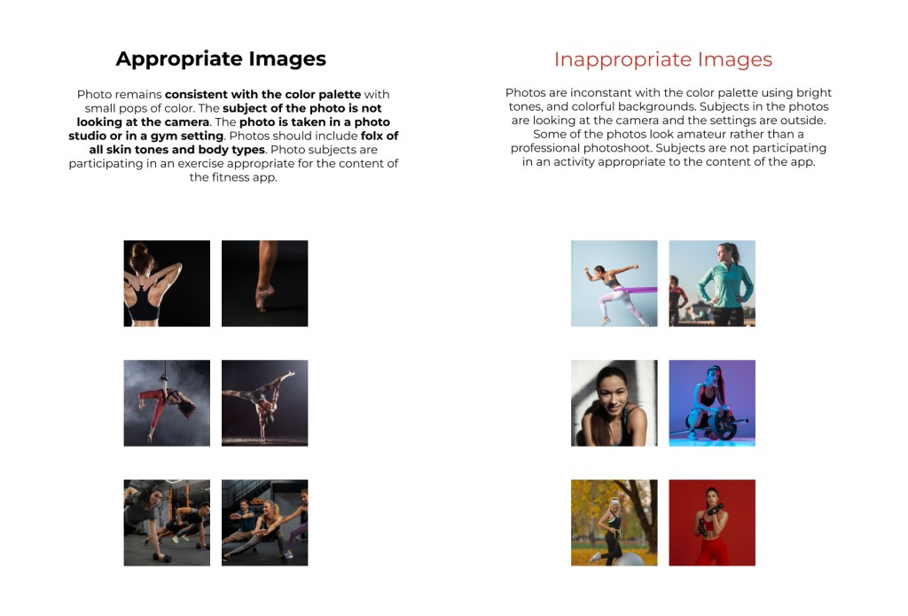 In order for the photos to convey the sense being “in action”, I chose images where the subject was in movement and not looking at the camera. Reflecting the places the user would engage with the app, I selected images of people in the gym or working out at home.