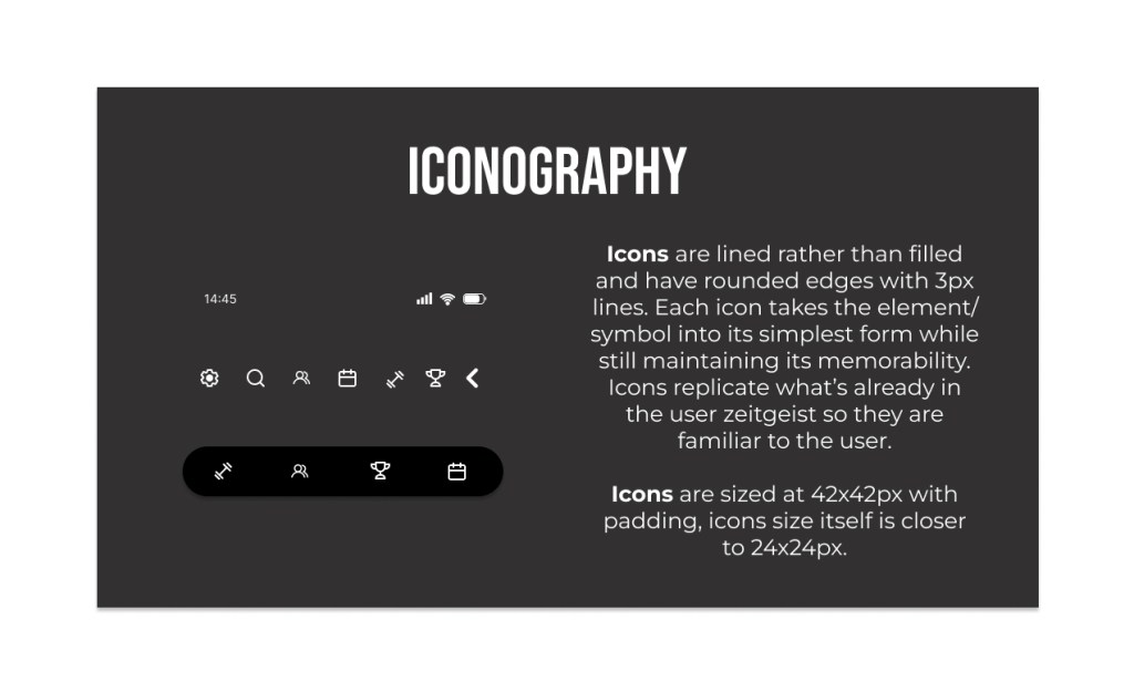 Familiarity for the user was a priority, so I chose an icon style that was simple, lined and rounded. This icon style is used across other fitness apps like Nike and Peloton.