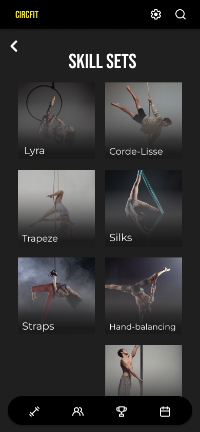 Current fitness apps on the market do not cater to the specific needs of a circus artist. They do not provide circus specific training or workouts tailored to a circus apparatus or skillset. This limits artists in staying circus fit, inspiring their training and connecting with other professionals and friends.