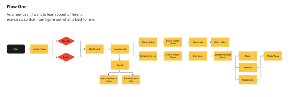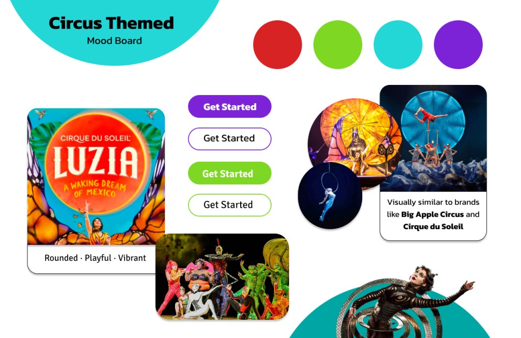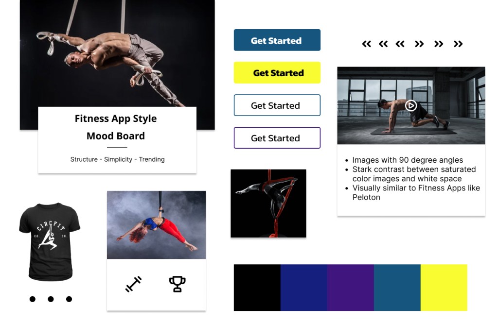 One board was inspired by top circus companies like Cirque de Soleil with bright, primary colors and rounded buttons. The other mood board was inspired by successful fitness apps like Peloton with a darker color palette and a pop of vibrant color.