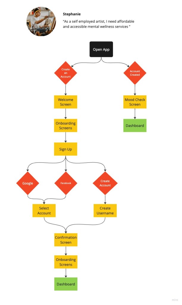 By mapping user flows based on the information from research and interviews, I was able to paint a clear picture of how Stephanie will navigate the app.